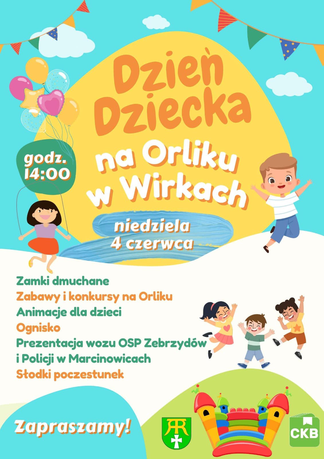 Zapraszamy na Dzień Dziecka oraz Piknik Rodzinny w Wirkach. Organizatorzy zapraszają w niedzielę 4 czerwca 2023 r. o godz. 14:00 na Orlik w Wirkach. W programie gry, zabawy, ognisko, animacje, wizyta strażaków, zamki dmuchane oraz spotkanie z produktem lokalnym wraz z degustacją. Zapraszamy!