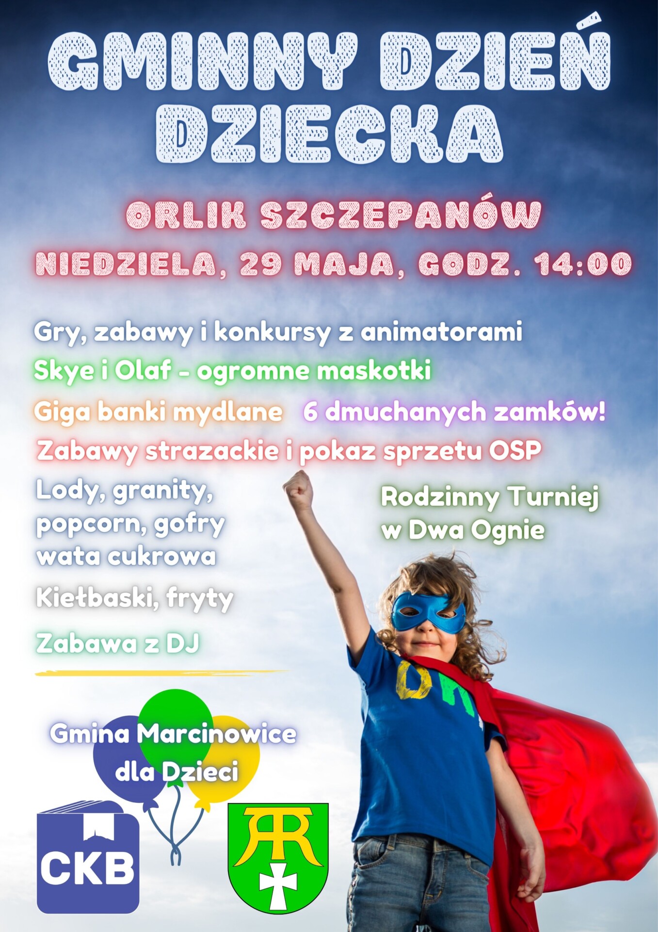 Zapraszamy Was na wielkie świętowania Dnia Dziecka. Moc atrakcji czeka na najmłodszych w niedzielę 29 maja na kompleksie sportowym Orlik w Szczepanowie.